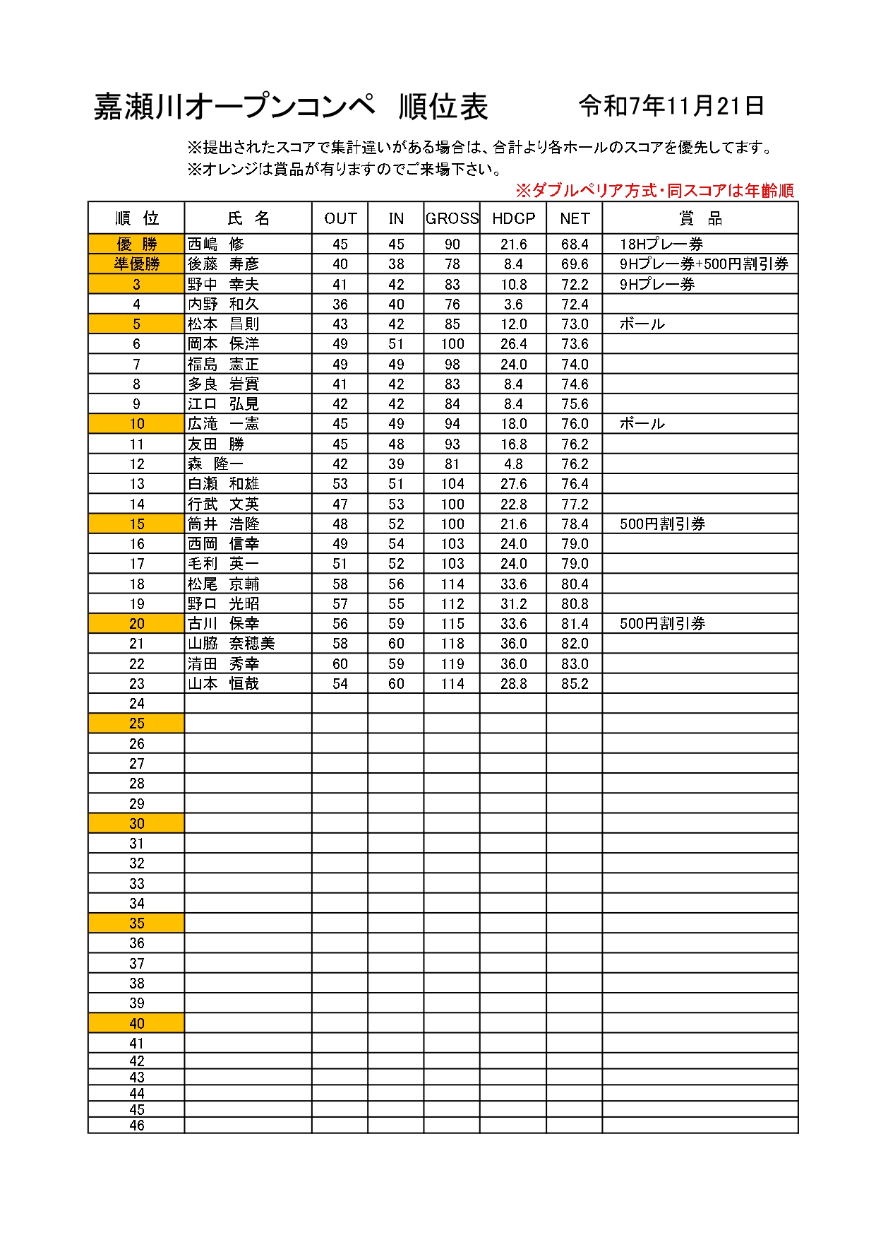 11月21日(金)のオープンコンペの順位表はこちらです!